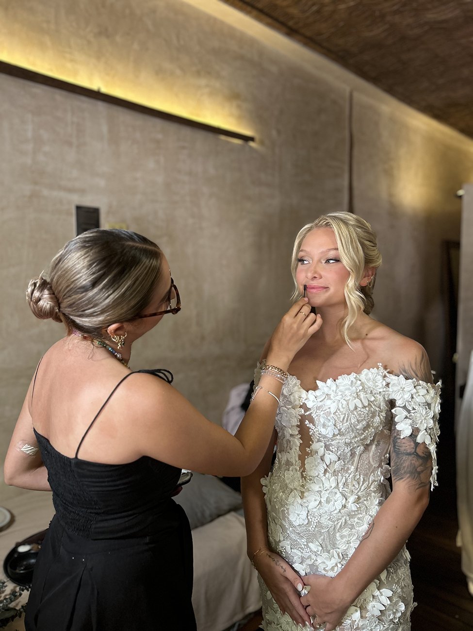 Peinado personalizado, ya sea que sueñes con ondas suaves, un moño moderno o un recogido con estilo editorial, crearemos un look que complemente tu vestido y estética general.